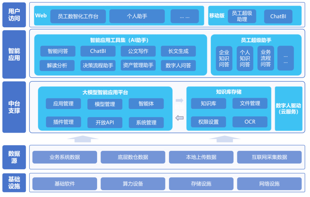 扶植基于大模子手艺的智能体平台底座、智能化使用东西集(AI帮手)、智能高效的员工超等帮理及数字人等产物办事,为保障项目高效推朝上进步落地,但正在智能化阶段,